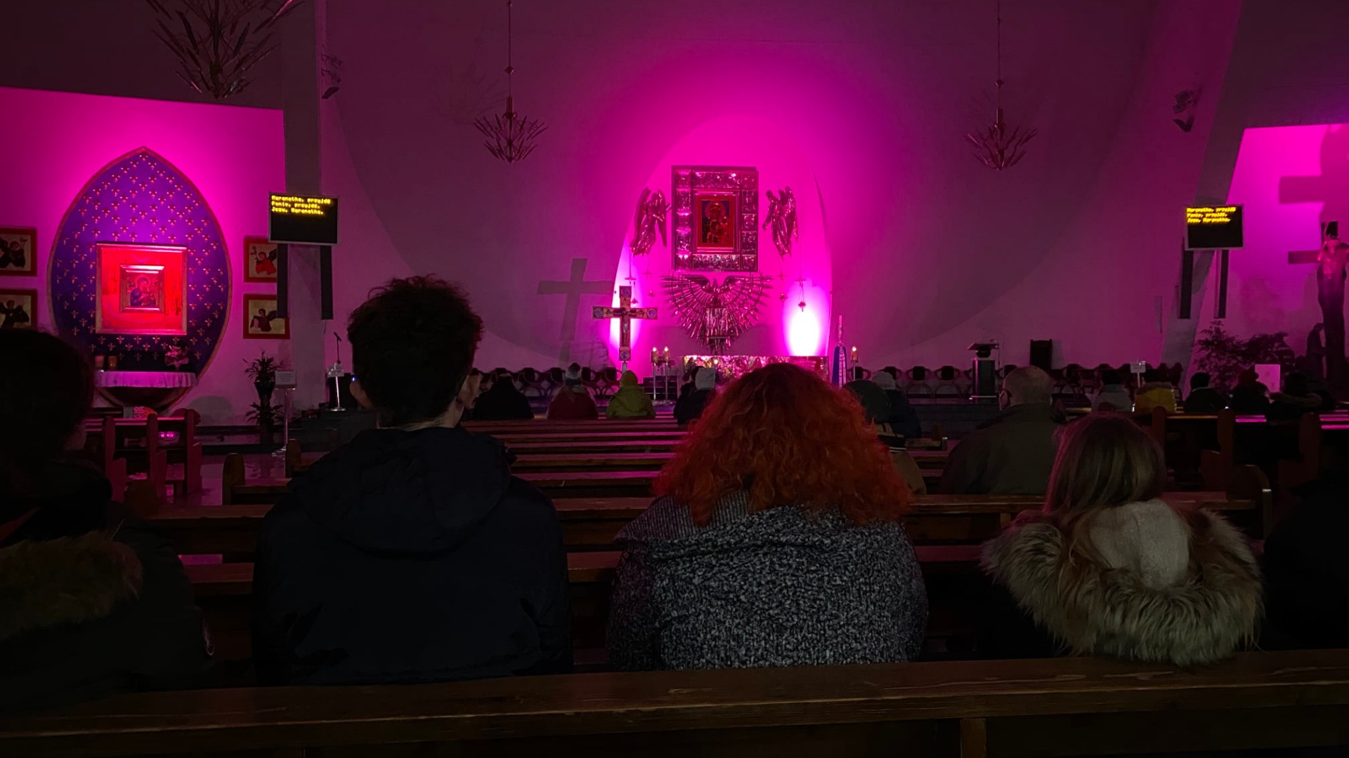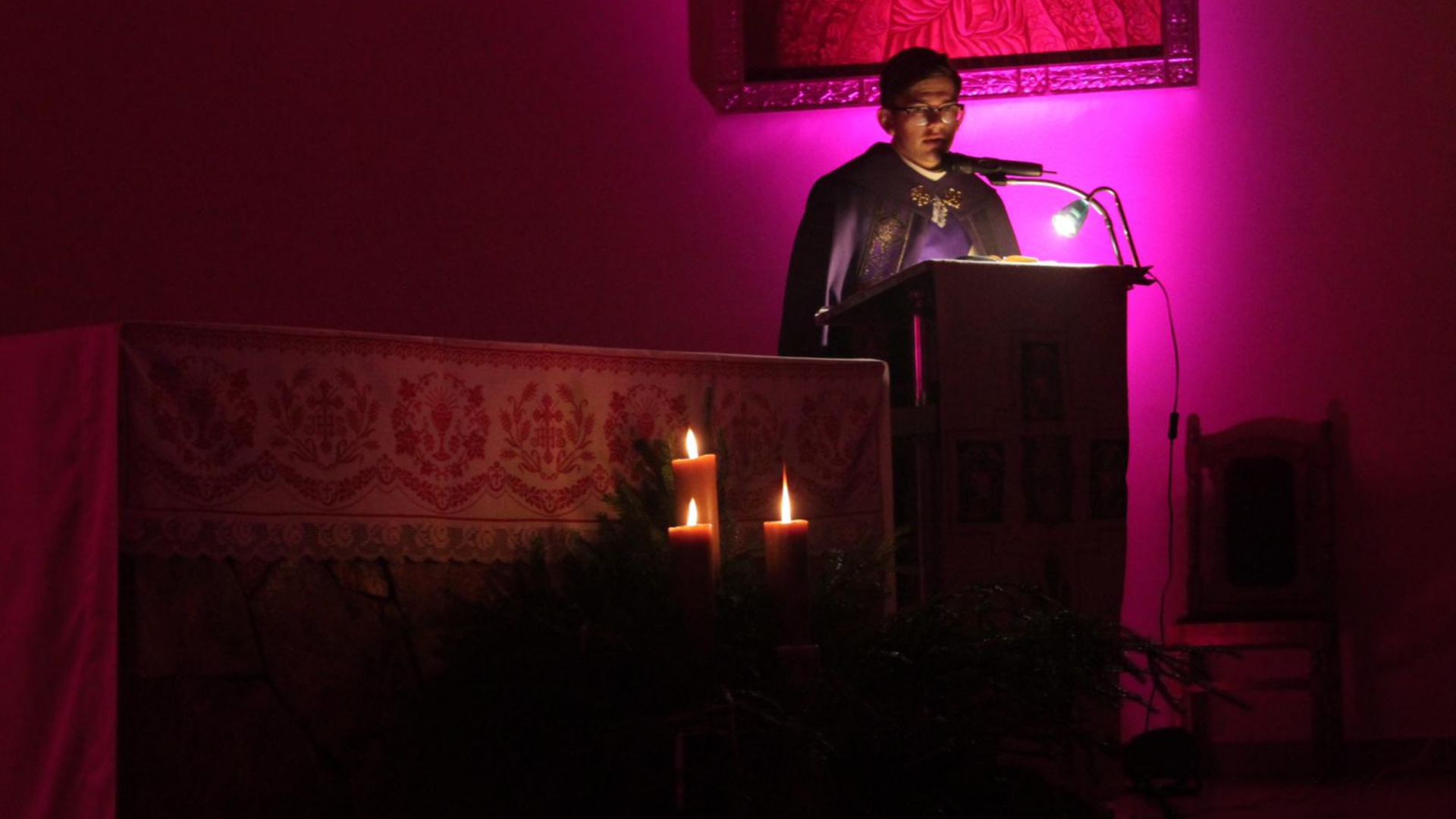W czasie adwentowego czuwania diakon Tomasz zadbał o symbole: fioletowe światło, cztery świece, dym z trybularza. Wszystkie elementy sprzyjały atmosferze modlitwy i pomagały w skupieniu.