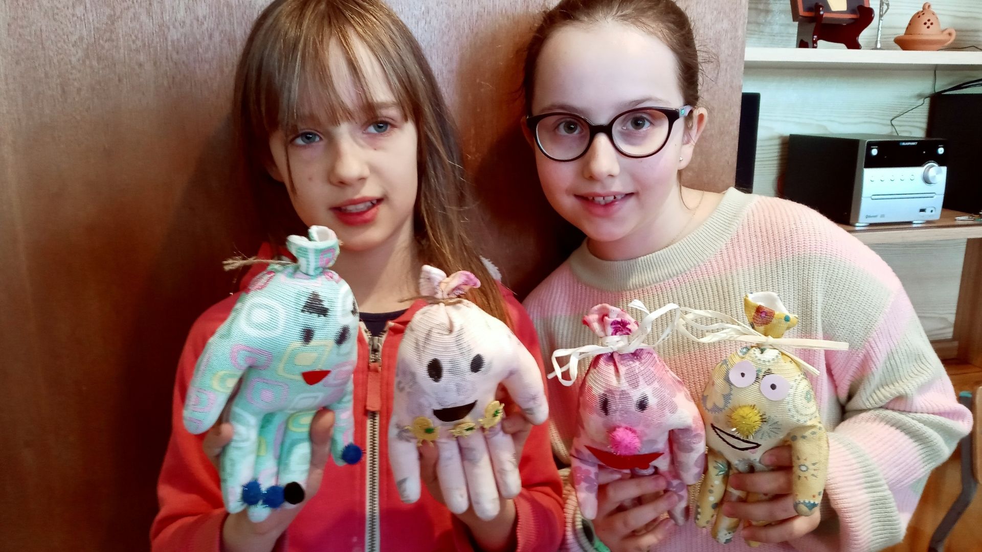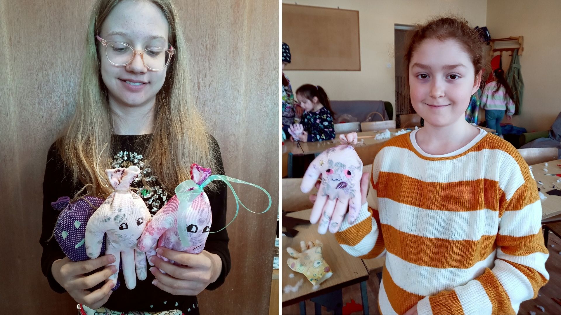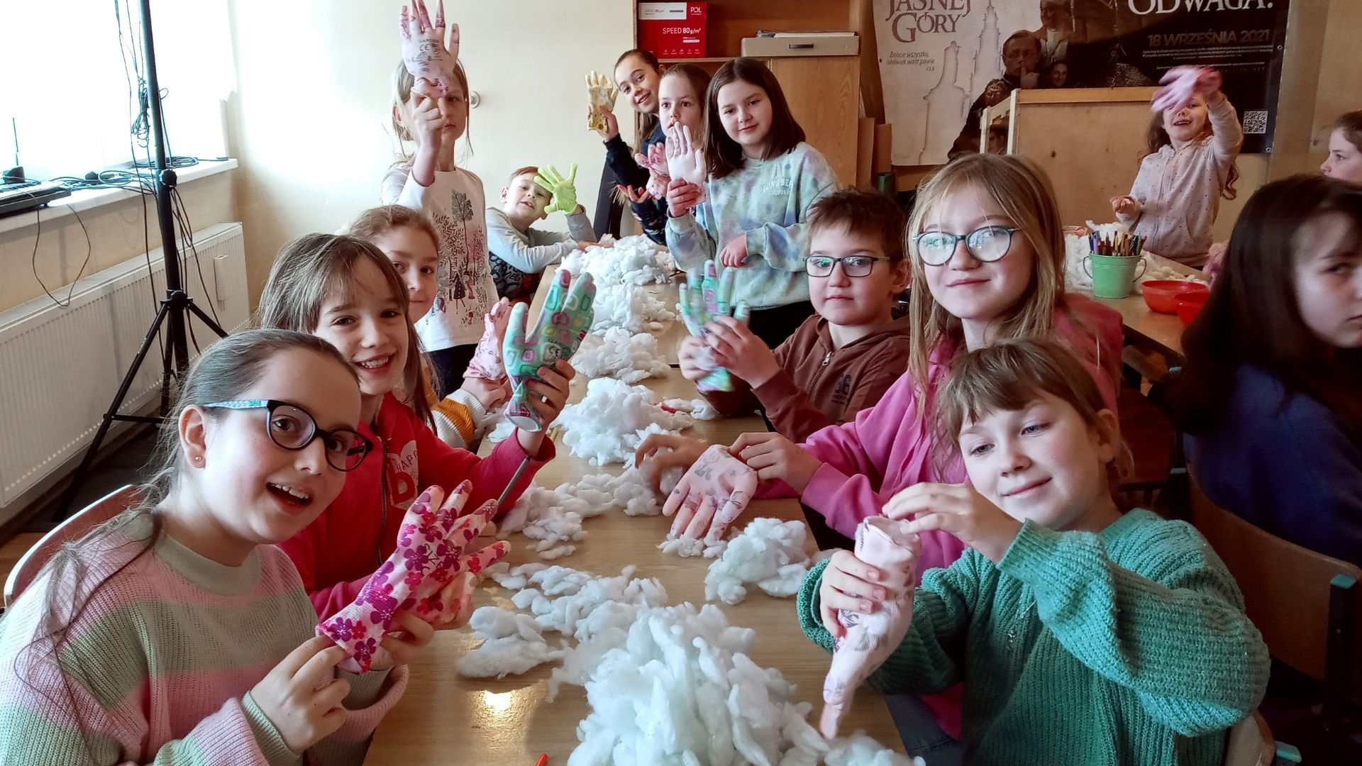 Druga część spotkania miała charakter warsztatowy. Tym razem dzieci miały możliwość wykonać z kolorowych, ogrodowych rękawiczek maskotki. Najpierw wypełniły rękawiczki syntetycznym wsadem do poduszek, a następnie udekorowały swoje maskotki, dolepiając im oczy, buzię, włosy i inne ozdoby. Największe wrażenie zrobiła na wszystkich praca Zuzi, która z rękawiczki wykonała słonia!