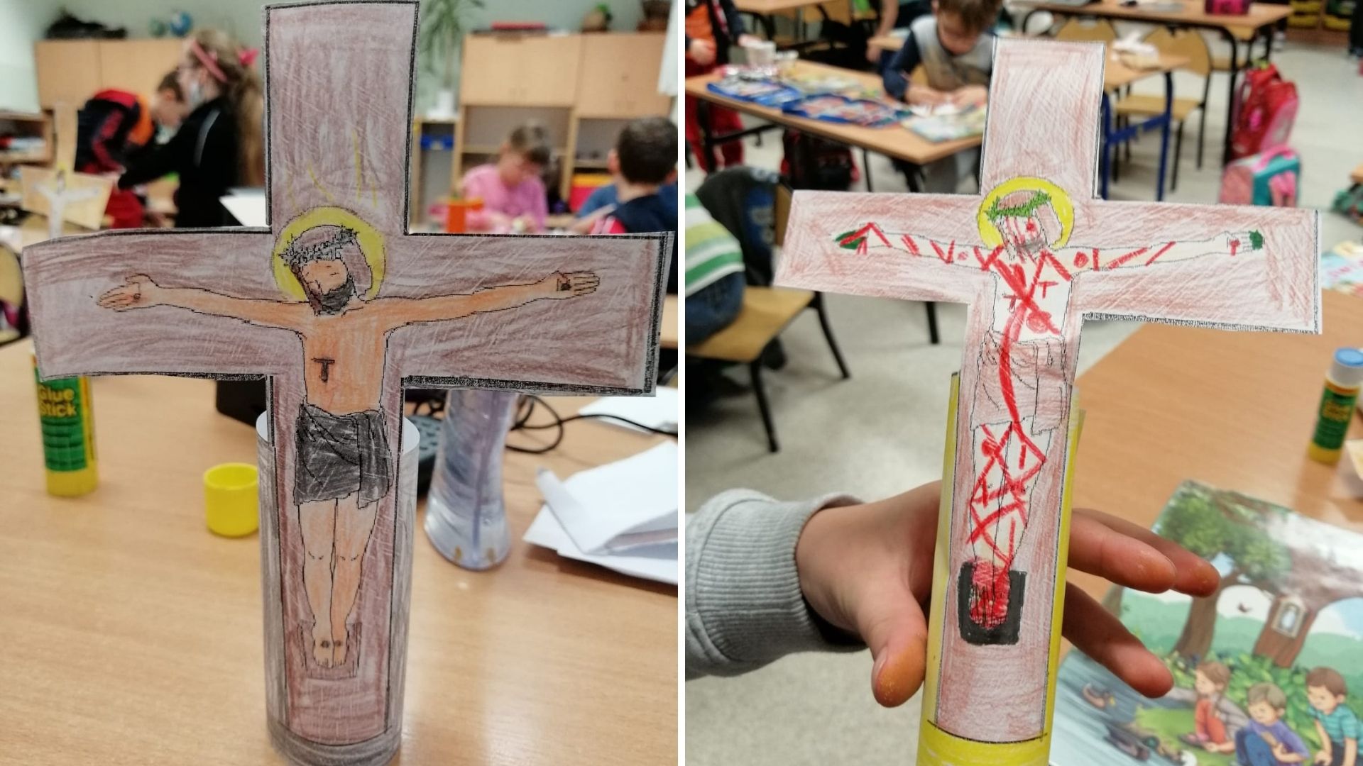 Siostra Paulina Klejny dodatkowo ze swoimi uczniami w szkole na katechezie wykonała prace plastyczne dotyczące drogi krzyżowej Pana Jezusa. Klasy pierwsze wykonały krzyż do postawienia na biurku lub szafce, a klasy drugie namalowały na chuście oblicze Pana Jezusa.