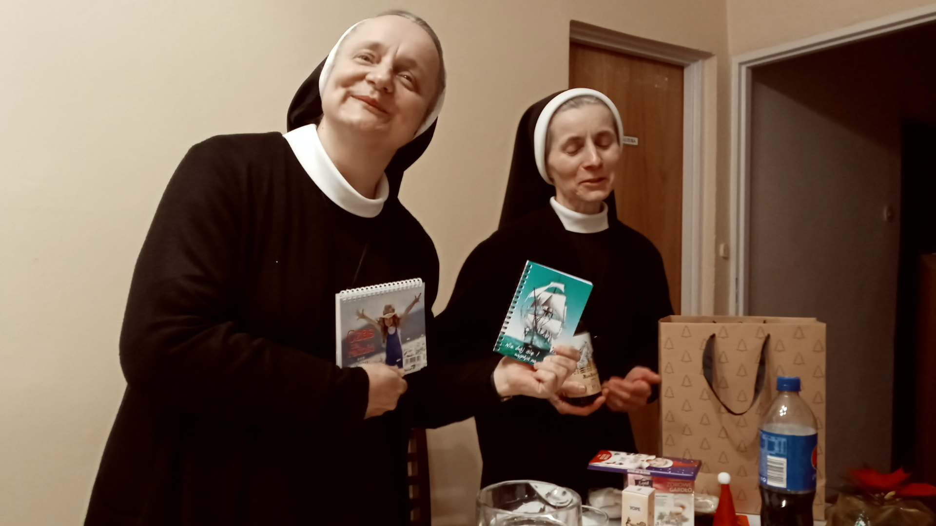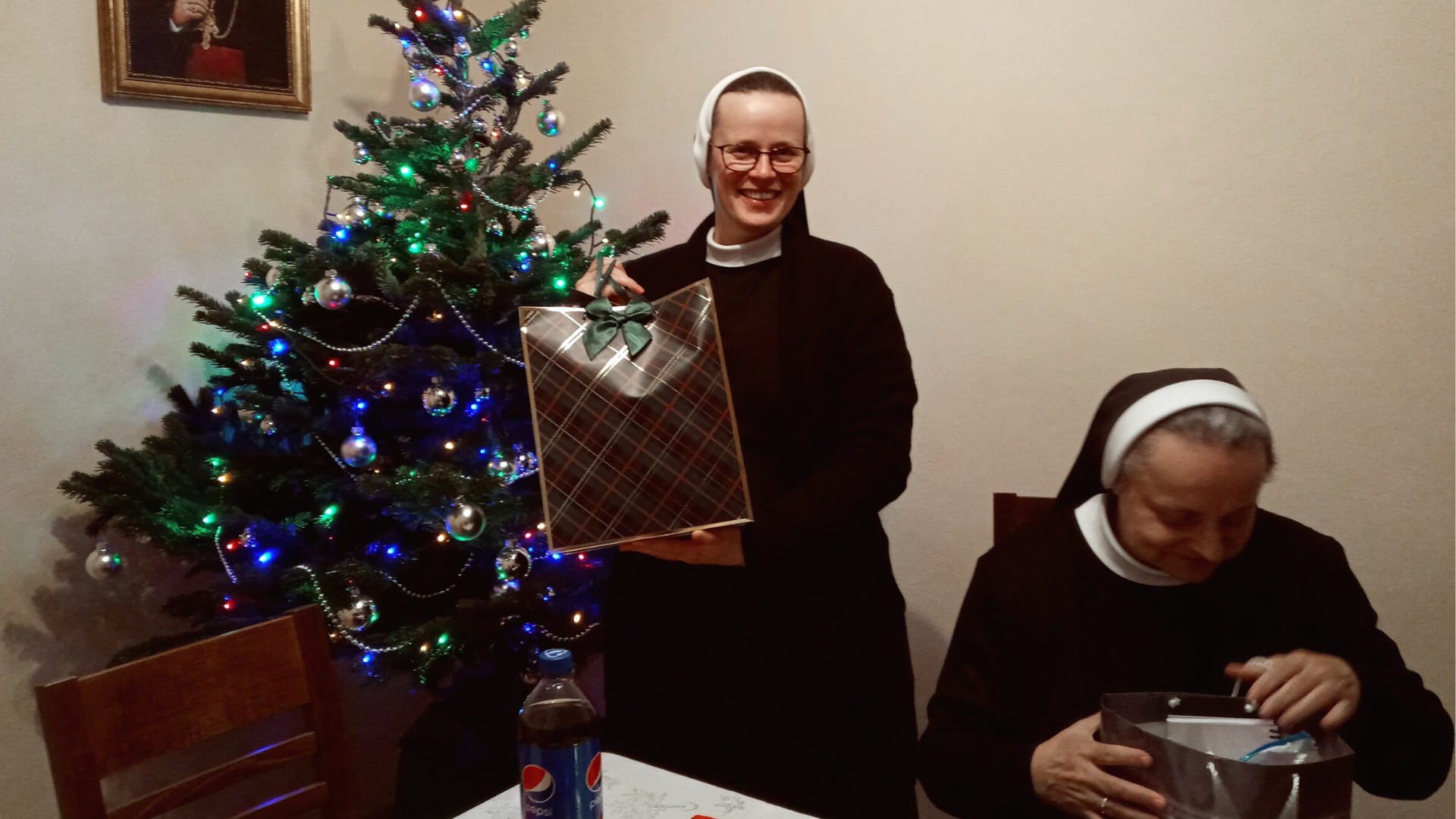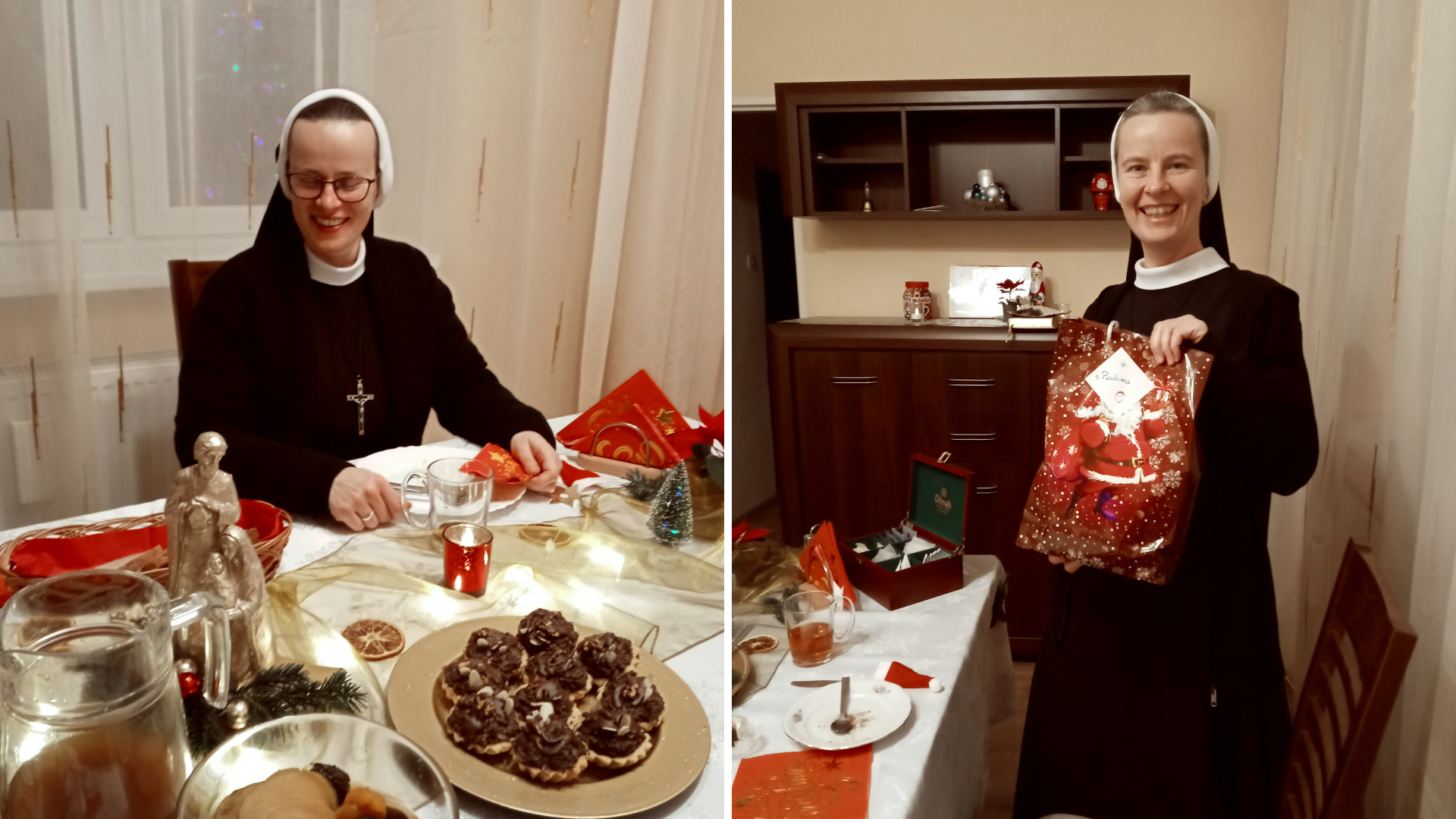 W refektarzu najpierw odczytałyśmy fragment z Pisma Świętego, a potem życzenia świąteczne przysłane z domu generalnego. Podzieliłyśmy się opłatkiem. Śpiewałyśmy razem kolędy i rozmawiałyśmy ze sobą, dzieląc się swoimi refleksjami i przemyśleniami. Po posiłku oglądałyśmy prezenty. Sprawiło to nam dużo radości.