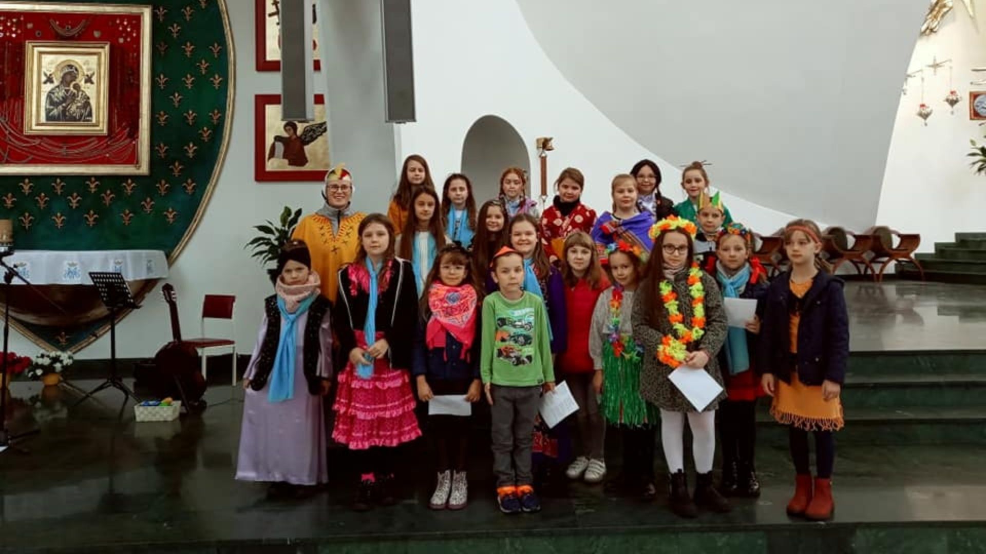Następnego dnia 24 października 2021 roku schola przebrała się za dzieci z różnych stron świata. Na Mszy świętej niedzielnej o godz. 11.00 najmłodsi parafianie śpiewali misyjne piosenki, by w ten sposób włączyć się w dzieło ewangelizacji oraz zaznaczyć życzliwość i szacunek wobec wszystkich misjonarzy.
