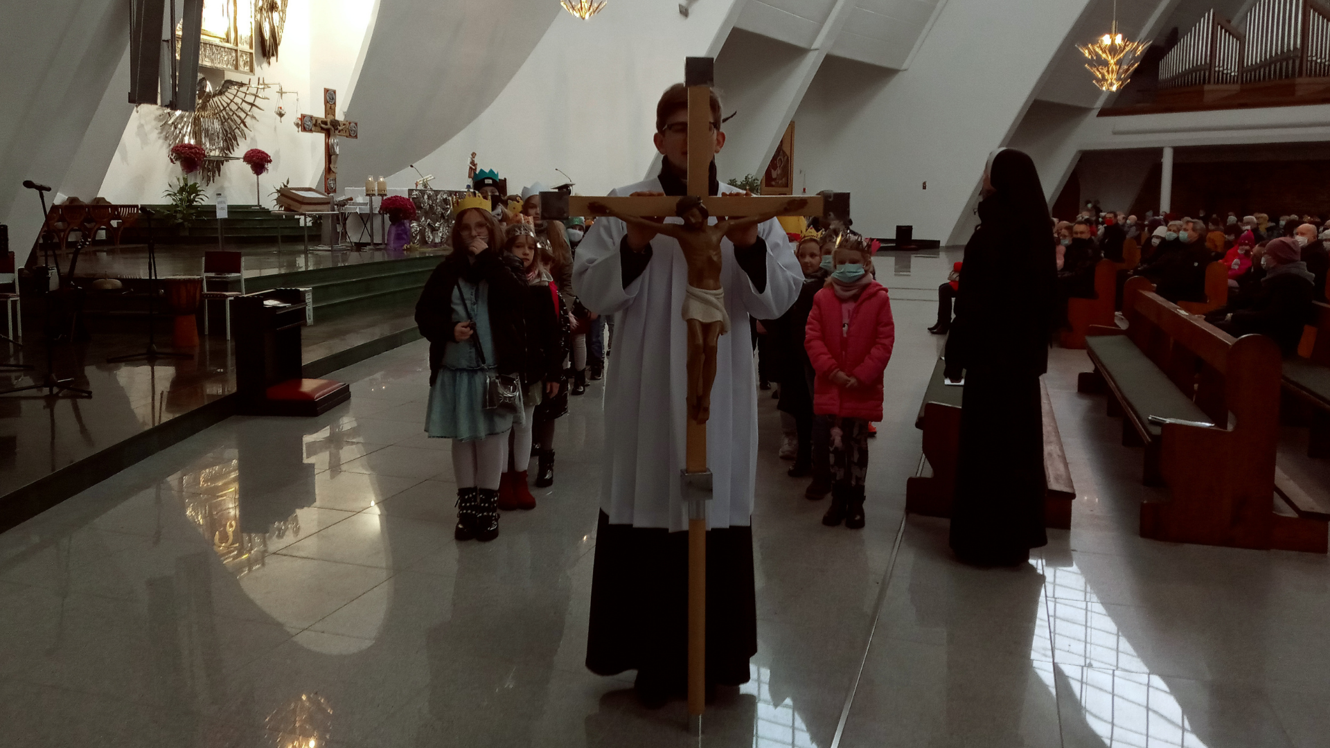 Najmłodsi parafianie wzięli udział w procesji na wejście. Idąc za krzyżem do ołtarza śpiewali razem: Króluj nam Chryste zawsze i wszędzie, to nasze rycerskie hasło.