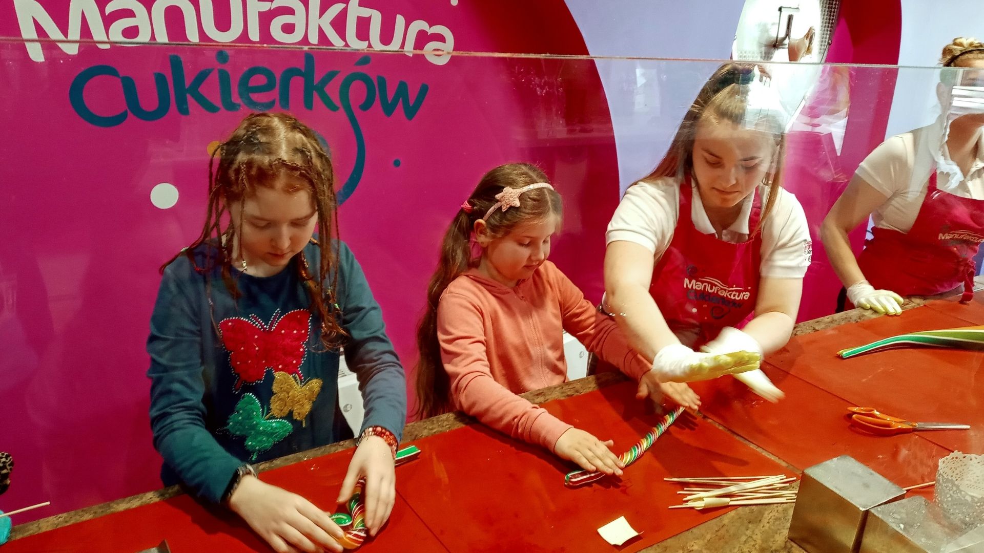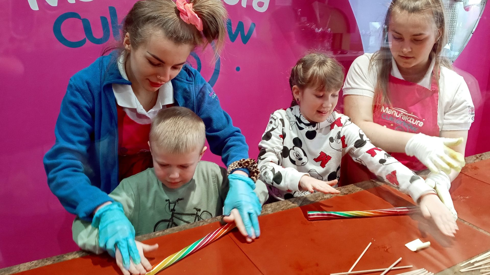 Nasza przygoda rozpoczęła się o godz. 9.00. Na toruńską Starówkę, gdzie znajduje się manufaktura słodyczy, przemieściliśmy się komunikacją miejską. Chłopcy i dziewczynki najpierw uczestniczyli w pokazie wyrobu masy cukierniczej, a potem wzięli udział w warsztatach. Każdy z uczestników zajęć mógł samodzielnie wykonać słodkiego lizaka. Dzieci były zachwycone!