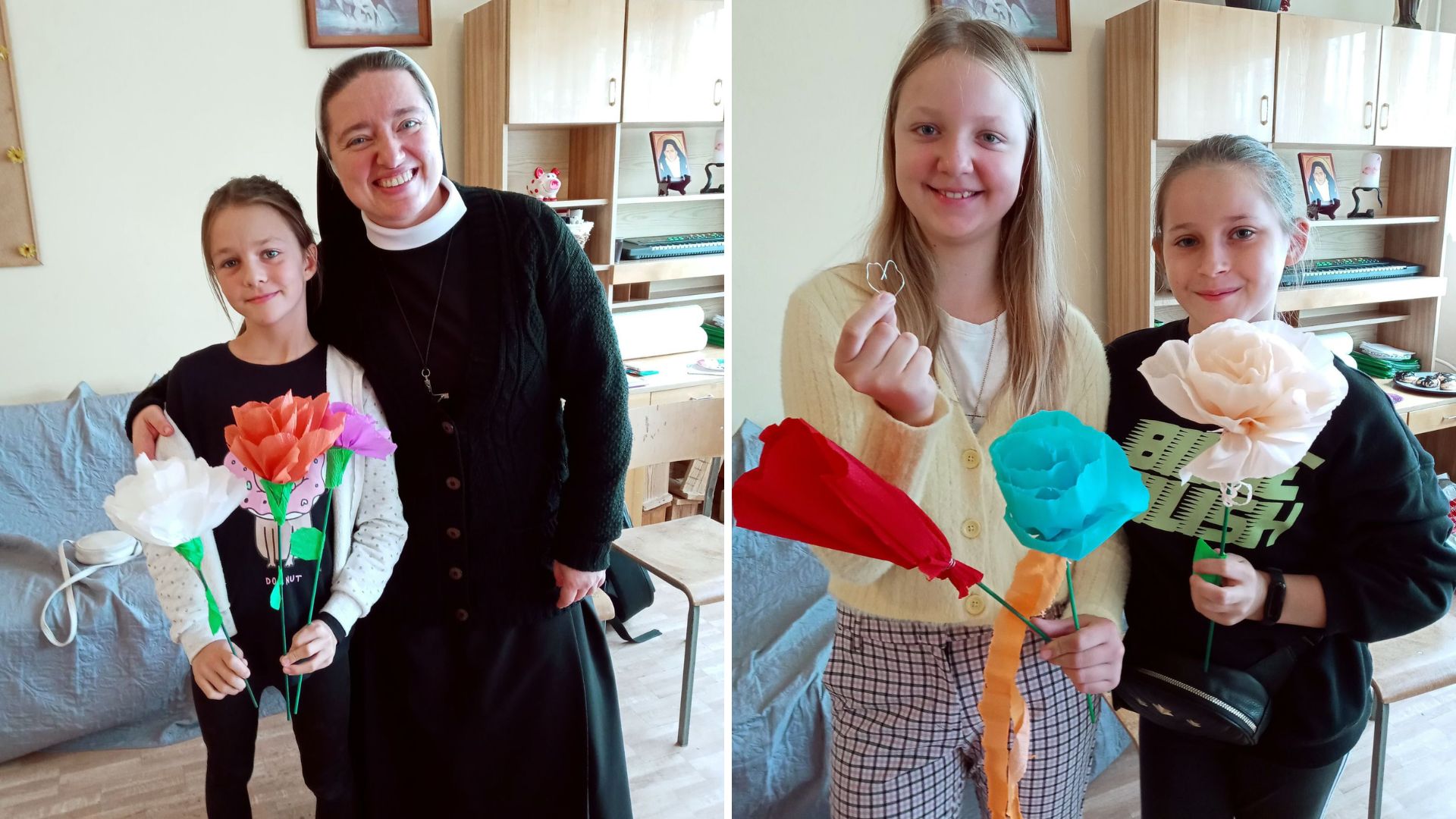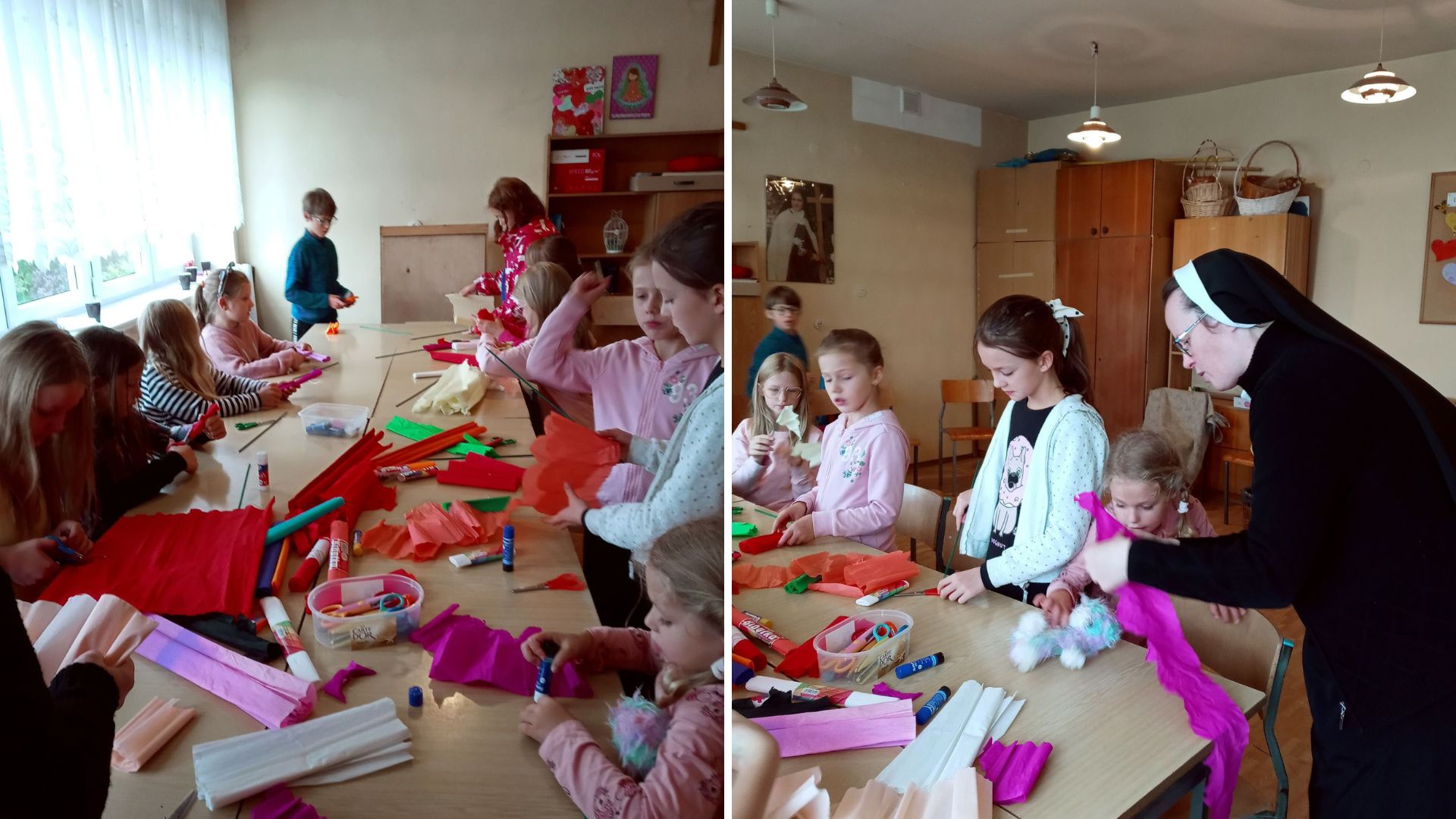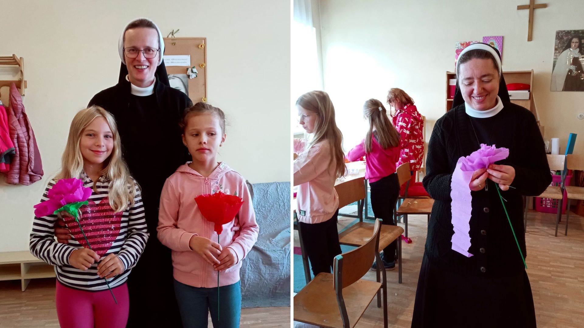 Podczas spotkania wspominaliśmy obietnicę, jaką św. Teresa od Dzieciątka Jezus złożyła wstępując do nieba. Przyrzekła, że będzie z nieba spuszczać deszcz różanych łask. Dzieci podczas warsztatów plastycznych własnoręcznie wykonały róże z kolorowej krepiny. Róże mają przypominać dzieciom o Małej Teresie z Lisieux i zachęcać do modlitwy przez Jej wstawiennictwo.
