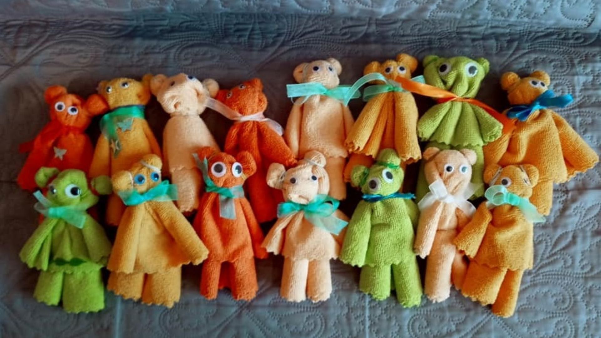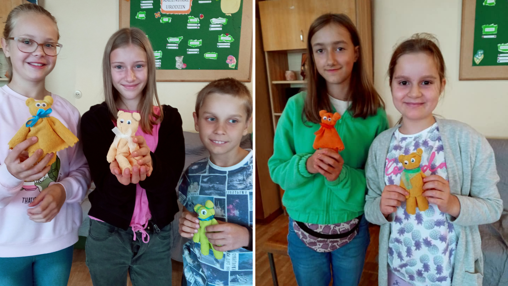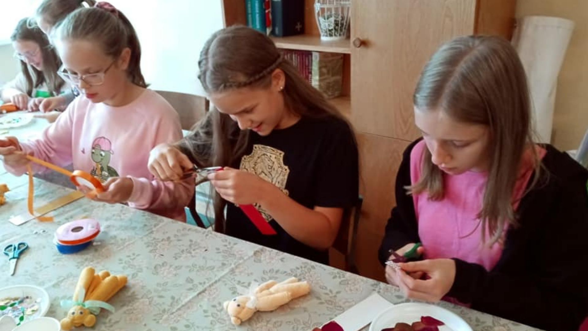 W części warsztatowej spotkania dzieci wykonywały zakładkę do książki oraz misia z materiału. Pracy towarzyszyło mnóstwo pozytywnych emocji. Dzieci pomagały sobie wzajemnie, szczególnie przy składaniu materiału. Mistrzem okazała się Lena, która sprytnie i szybko poradziła sobie z wszelkimi zawiłościami.